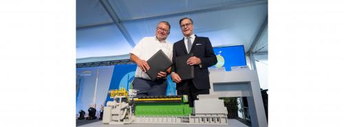Joachim Morsch, Vorstand und Sprecher Energie SaarLorLux AG (links), und Olaf Berlien, President und CEO der Innio Group, bei der Unterzeichnung der Absichtserklärung Quelle: Innio / Holger Kiefer |