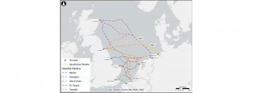 Potenzielle Pipelineverläufe für Wasserstoff zwischen Großbritannien und Kontinentaleuropa (zur Vollansicht bitte auf die Grafik klicken) Quelle: Dena / Adelphi / Arup |