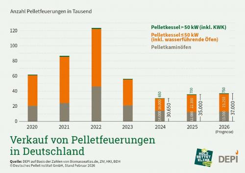 Für 2026 rechnet die Branche mit einem ähnlichen Absatzniveau wie im Vorjahr. Erwartet wird der Verkauf von rund 13.000 Pelletkaminöfen, die in der Regel in der Wohnung aufgestellt werden. Rund 23.000 Pelletkessel bis 50 kW und wasserführende Pelletkaminöfen kommen hinzu, diese werden als eigenes Heizungssystem im Heizungsraum installiert. Hinzu kommen 750 größere Pelletfeuerungen und Kraft-Wärme-Kopplungsanlagen. Damit wären bundesweit bis zum Jahresende rund 777.500 Pelletanlagen in Betrieb.