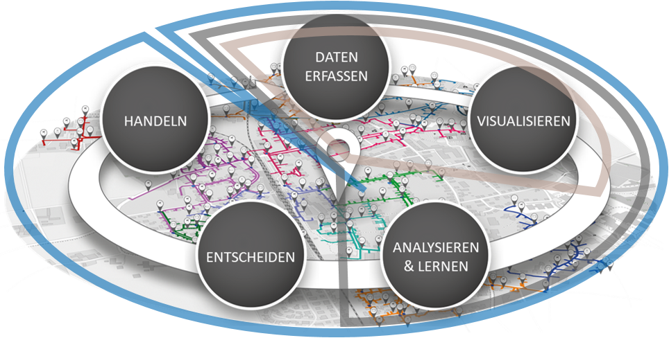 Mit der VIVAVIS Smart Grid Operation Platform (SGOP) sind Netzbetreiber in der Lage, den heutigen und künftigen technischen Herausforderungen bei der Sicherstellung der Versorgungssicherheit in der Niederspannung zu begegnen. Sie macht das Niederspannungsnetz smart, indem der folgende Handlungskreis aus Datenerfassung, Visualisierung, Analyse, Erkenntnisgewinn, Entscheidungsfindung und Handlungsableitung in einem geschlossenen Regelkreis mündet, der automatisiert und fortlaufend abläuft.