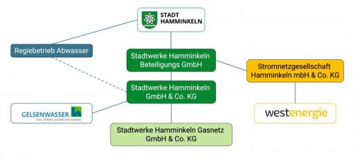 So sollen die neuen „Stadtwerke Hamminkeln KG“ im Beteiligungsgeflecht aussehen: über ihnen eine 100-prozentig städtische Beteiligungsgesellschaft, die Altkonzessionäre sind auf unterschiedlichen Ebenen am künftigen Kommunaleigentum beteiligt. Quelle: Stadt Hamminkeln |
