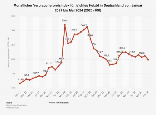 Im Mai 2024 lag der Verbraucherpreisindex für leichtes Heizöl in Deutschland nach Angaben des Statistischen Bundesamtes bei einem Wert von 211,9 Punkten. Basis des Index ist das Preisniveau des Jahres 2020. Im Vergleich zum Vorjahresmonat stieg der Index um etwa 18 Punkte.