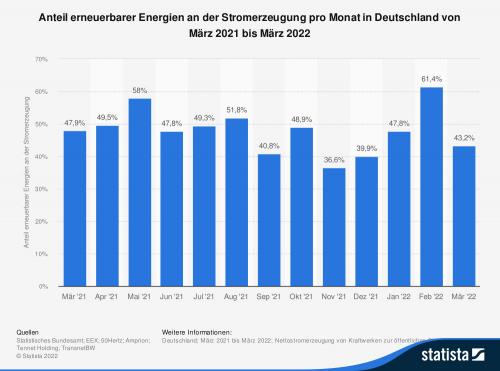 Die Statistik zeigt den monatlichen Anteil erneuerbarer Energien an der Stromerzeugung in Deutschland von März 2021 bis März 2022. Im März 2022 betrug der Anteil erneuerbarer Energien an der Stromerzeugung in Deutschland laut Quelle rund 43,2 Prozent. Der Durchschnittswert für das Jahr 2022 lag bei insgesamt 51,3 Prozent (Stand: März 2022).