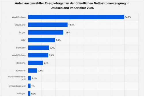 Den Löwenanteil an der deutschen Stromerzeugung im Oktober lieferte Windkraft mit knapp 35 Prozent, gefolgt von Braunkohlestrom mit 14,4 Prozent und Erdgas mit knapp 13 Prozent. Steinkohleverstromung steuerte fünf Prozent bei. 2024 zählte Deutschland zu den Top 10 der Länder mit dem weltweit größten Stromverbrauch − dieser lag bei rund 464 Milliarden kWh. Den größten Anteil am nationalen Stromverbrauch hatte mit über 40 Prozent zuletzt der Industriesektor. Haushalte verursachten hingegen nur 28 Prozent.