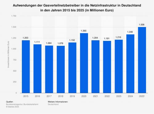 Die Statistik zeigt die Entwicklung der Aufwendungen der Gasverteilnetzbetreiber in Deutschland für die Netzinfrastruktur in den Jahren 2015 bis 2025. Im Jahr 2024 betrugen diese in Deutschland rund 1,34 Milliarden Euro. Die Zahl für 2025 ist ein vorläufiger Wert.