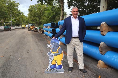 Erdwin, so der Name des freundlichen Maulwurfs, wird künftig stau- und staubgeplagten Wiesbadenern entgegenlächeln. Hier posiert er zusammen mit seinem Chef, dem Vorstandsvorsitzenden der ESWE Versorgungs AG, Jörg Höhler.