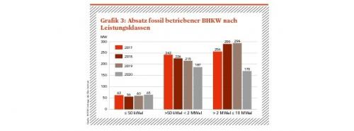Betrachtet man den Absatz der fossil betriebenen BHKW nach ihren Leistungsklassen (Grafik 3), zeigt sich, dass der Rückgang am stärksten in der Leistungsklasse >2 MW