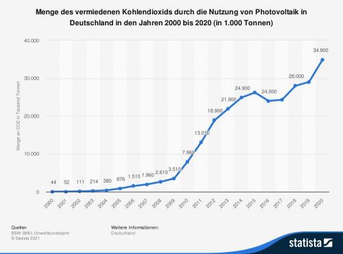 Die Statistik zeigt die Entwicklung der Menge des vermiedenen Kohlendioxids durch die Nutzung von Photovoltaik in Deutschland. Im Jahr 2020 konnten in Deutschland rund 34,9 Mio. Tonnen CO2 durch den Einsatz von Solarstrom eingespart werden.
