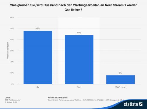 Im Zuge der Sanktionen gegen Russland steht die Energieversorgung in Deutschland vor großen Herausforderungen. Von entscheidender Bedeutung ist die Energieversorgung über die Ostsee-Pipeline Nord Stream 1. Nach derzeit stattfindenden routinemäßigen Wartungsarbeiten ist ein Weiterbetrieb jedoch fraglich. Laut einer Umfrage des ZDF-Politbarometers Mitte Juli 2022 rechneten rund 44 % der befragten Personen nicht damit, dass Russland nach der Wartung erneut Gas liefern wird.