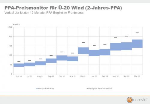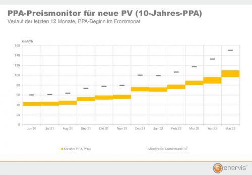 Der Mischpreis für einen zweijährigen Solar-PPA mit Lieferbeginn im Frontmonat Juni 2022 lag damit im Mai 2022 bei rund 220