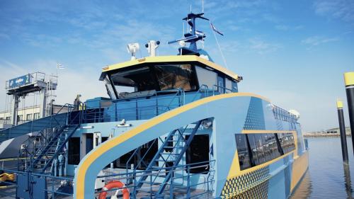 Fahrgäste binnen 20 bis 30 Minuten zwischen Norddeich und Norderney - emissionsfrei und fast geräuschlos. Der Antrieb erfolgt ausschließlich mit regional erzeugtem Solarstrom, der über eine PV-Anlage auf den Parkplätzen des Unternehmens gewonnen wird. Hinzu kommen ein Batteriespeichersystem sowie ein intelligentes Lastmanagement, das den Strom zwischen dem Fährbetrieb und E-Auto-Ladesäulen aufteilt. Die „Frisia E-1“ ist für 150 Passagiere ausgelegt. Dank einer Ladeleistung von 1,8