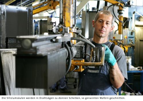 Vor 20 Jahren hatte die Solarindustrie keine eigenen Produkionsstätten für Silizium (hier eine Siliziumsäge; Bild von 2009) Quelle: Solar World |