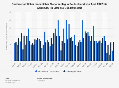 Im April 2025 betrug der durchschnittliche Niederschlag in Deutschland 31 Liter pro Quadratmeter. Das vieljährige Mittel liegt bei 58 Litern pro Quadratmeter. Damit gab es im Vorjahresmonat vergleichsweise etwas mehr Niederschlag. Fällt zu viel Niederschlag in kurzer Zeit, wird laut dem Deutschen Wetterdienst von einem Starkregenereignis gesprochen. Es folgen Sturzfluten und Überschwemmungen. Regnet es jedoch weniger als der Soll-Wert für die Periode vorgibt, so können sich unter anderem die Anzahl der Waldbrände und die Dürreschäden erhöhen.