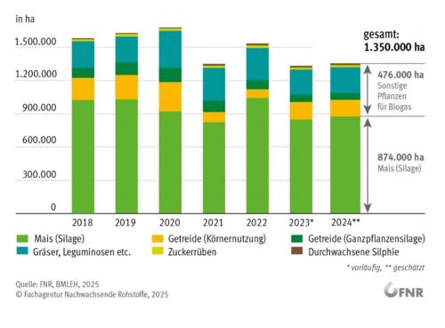 Bei der Bewertung der Entwicklung des Energiepflanzenanbaus für Biogas in Deutschland ist zu beachten, dass die beobachtbaren Veränderungen in den Anbauflächen nicht zwangsläufig mit der Entwicklung der gesamten Biogasproduktion oder der eingesetzten Rohstoffmengen übereinstimmen, so die Fachagentur Nachwachsende Rohstoffe, von der diese Grafik stammt. Ursache dafür sind starke Schwankungen der Flächenerträge, insbesondere bei Mais. Diese Ertragsschwankungen führen dazu, dass auch der Flächenbedarf zur Deckung des Rohstoffbedarfs der Biogasanlagen erheblich variiert – obwohl die Biogasproduktion insgesamt in den vergangenen Jahren weitgehend stabil geblieben ist. Die Grafik stammt aus dem aktuellen Bericht über den Anbau und Verwendung nachwachsender Rohstoffe in Deutschland.