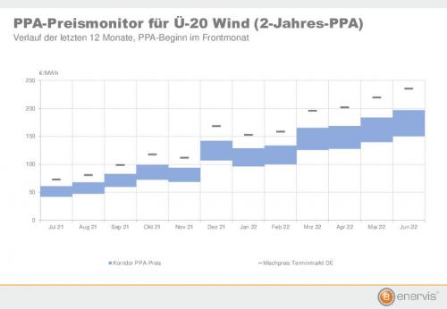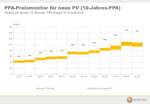 Der Terminmarkt-Mischpreis für einen zweijährigen PPA mit Beginn im Frontmonat (also im Juli 2022) lag im Juni bei rund 235 Euro/MWh, für einen zehnjährigen PPA bei gut 145 Euro/MWh.