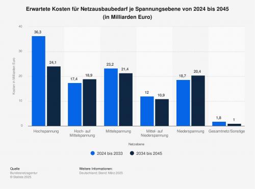 Um die Stromversorgung allgemein und in Bezug auf die Energiewende weiterhin zu gewährleisten, werden laut Bundesnetzagentur zwischen 2024 und 2033 rund 109 Milliarden Euro für den Ausbau des Verteilernetzes benötigt, der Großteil davon im Bereich der Hochspannung.