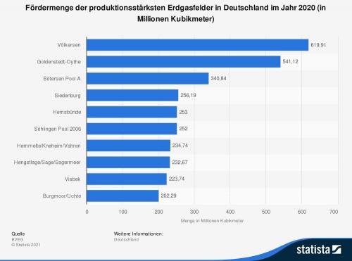 Die Statistik zeigt die Fördermenge der produktionsstärksten Erdgasfelder in Deutschland im vergangenen Jahr. Im Erdgasfeld Burgmoor/Uchte (Niedersachsen) beispielsweise wurden im 2020 rund 202,3