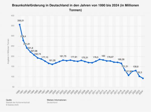 Der Kohleausstieg in Deutschland kommt. Bis zum Jahr 2038 soll der komplette Ausstieg aus der Kohle zur Stromgewinnung in Deutschland abgeschlossen werden. Dies hat auch starken Einfluss auf die Kohleförderung. Im Jahr 2024 wurden rund 91,9 Millionen Tonnen Braunkohle in den Tagebauen der vier Bundesländer Nordrhein-Westfalen, Brandenburg, Sachsen und Sachsen-Anhalt gefördert. In den deutschen Kohlekraftwerken wurden in diesem Jahr etwa 80,9 Millionen Tonnen eingesetzt.
