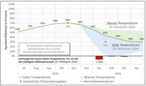 - Bei mittleren bis warmen Temperaturen würden die Gasspeicher „moderat bis umfangreich entleert“. In beiden Fällen ließe sich die gesetzliche Füllstandsvorgabe in Höhe von 30 Prozent am 1. Februar 2026 einhalten.