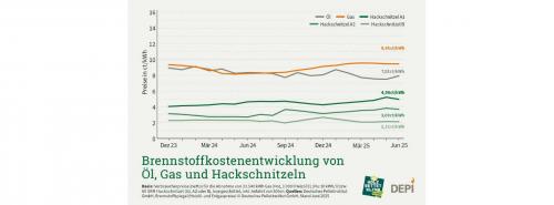 Entwicklung der Brennstoffkosten von Öl, Gas und Hackschnitzeln seit Dezember 2023 (zum Vergrößern bitte auf die Grafik klicken) Quelle: Depi |