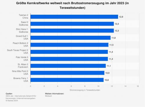 Die Statistik zeigt die größten Kernkraftwerke weltweit im Jahr 2023 nach Bruttostromerzeugung. Im Jahr 2023 erzeugte das chinesische Kernkraftwerk Taishan 2 rund 12,9 Milliarden Kilowattstunden Bruttostrom.