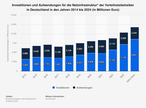 Die Statistik zeigt auf Basis der Daten des Bundeskartellamtes und der Bundesnetzagentur die Entwicklung der Investitionen und Aufwendungen für die Netzinfrastruktur der Verteilnetzbetreiber in Deutschland in den Jahren 2014 bis 2024. Im Jahr 2024 planen die deutschen Verteilnetzbetreiber rund 8,6