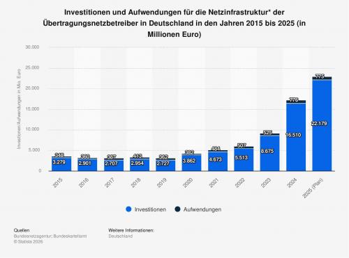 Die Statistik zeigt die Entwicklung der Investitionen und Aufwendungen für die Netzinfrastruktur der Übertragungsnetzbetreiber (ÜNB) in Deutschland in den Jahren 2015 bis 2025. Im Jahr 2024 investierten die vier deutschen Übertragungsnetzbetreiber (Tennet TSO GmbH, 50 Hertz Transmission GmbH, Amprion GmbH, EnBW Transportnetze AG) rund 16,5 Milliarden Euro in die Übertragungsnetzinfrastruktur, inklusive grenzüberschreitender Verbindungen. Die Investitionen für das Jahr 2025 fielen im Vergleich dazu höher aus. Die Werte basieren auf Angaben der Bundesnetzagentur.