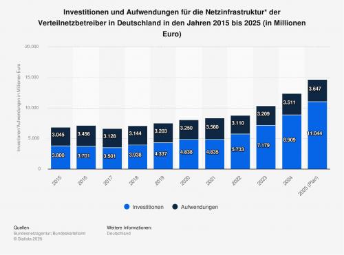 Die Statistik zeigt die Entwicklung der Investitionen und Aufwendungen für die Netzinfrastruktur der Verteilnetzbetreiber in Deutschland in den Jahren 2015 bis 2025. Im Jahr 2025 planten die deutschen Verteilnetzbetreiber rund 11 Milliarden Euro in die Netzinfrastruktur zu investieren, inklusive Mess-/Steuereinrichtungen und Kommunikationsinfrastruktur. Die Werte basieren auf Angaben von Bundesnetzagentur und Bundeskartellamt.