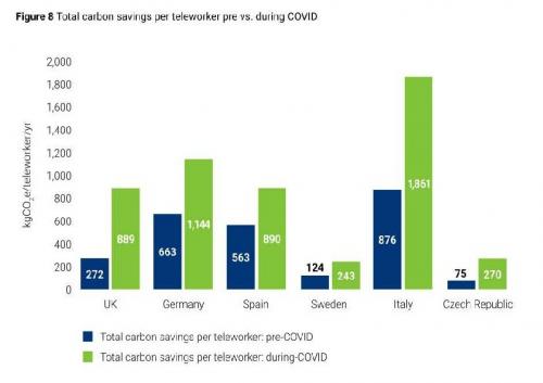 Eine Studie über die Effekte von Homeworking in sechs europäischen Ländern fand große Auswirkungen auf den CO2-Ausstoß heraus. Die Untersuchung des Carbon Trusts analysiert die Emissionen vor, während und nach der Covid-19-Pandemie. Durch den reduzierten Berufsverkehr und die vermiedenen bürobedingten Emissionen ergaben sich demnach weniger Treibhausgasemissionen trotz der zusätzlichen häuslichen Energieverbräuche.