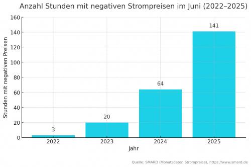 Die Zahl der Stunden mit negativen Strompreisen nimmt seit Jahren deutlich zu — ein Trend, der sich in diesem Jahr noch einmal dramatisch verstärkt hat. Im Juni 2025 wurden bereits 141 Stunden mit negativen Preisen am Day-Ahead-Markt der deutschen Strombörse verzeichnet. Das ist ein neuer Rekord. Zum Vergleich: Im Juni 2022 waren es gerade einmal 3 Stunden.
