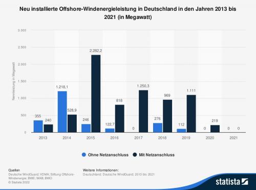 Die Statistik zeigt die jährlich neu installierte Windenergieleistung auf See in Deutschland 2013 bis 2021. Im Jahr 2021 wurden in Deutschland keine Offshore-Windenergieanlagen neu installiert und ans Stromnetz angeschlossen.