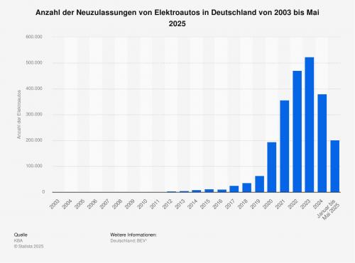 hervor. Das Jahr 2024 sah in Deutschland etwa 380.600 Neuzulassungen von E-Autos. Damit lag die Zahl im Vergleich zum Jahr 2023, als rund 524.200 reine Stromer neu zugelassen wurden, über 27 Prozent niedriger. Der Anteil der E-Autos an den gesamten Pkw-Neuzulassungen lag im Jahr 2024 bei 13,5 Prozent.