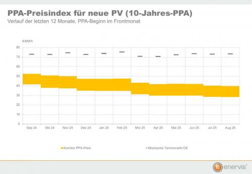Für PPA auf neue Photovoltaik-Freiflächenanlagen mit zehnjähriger Stromlieferung mit einem Lieferstart im September 2025 lag der Preiskorridor im August zwischen 28 Euro/MWh und 40 Euro/MWh. Der dazu korrespondierende Terminmarkt-Mischpreis im August für die betreffende PPA-Laufzeit lag bei circa 73 Euro/MWh.