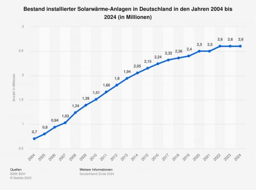 Die Grafik zeigt die Entwicklung des Bestands an Solarthermieanlagen in Deutschland seit 2004. Im Jahr 2024 existierten demnach in Deutschland rund 2,6 Millionen Anlagen zur Erzeugung von Energie aus Solarthermie. Die Statistik zeigt die kumulierte Anzahl der Solarheizungen in Deutschland in den Jahren 2004 bis 2024. Die Werte basieren auf Angaben des Bundesverbandes Solarwirtschaft (BSW)