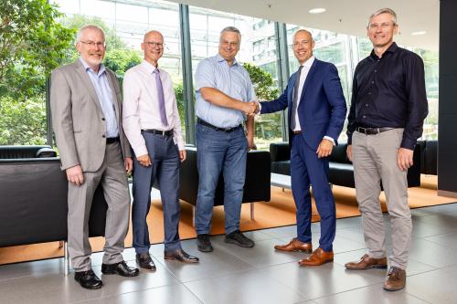| Die Westfälische Fernwärmeversorgung GmbH geht komplett an die Stadtwerke Münster: (v.l.) Arnim Schneidereit (Geschäftsführer FW), Thomas Haiber (Leiter Konzernservices SWM), Josef Kremer (Geschäftsführer SW Dinslaken), Sebastian Jurczyk (Geschäftsführer SWM) und Thomas Döking (Geschäftsführer FW). Quelle: SWM |