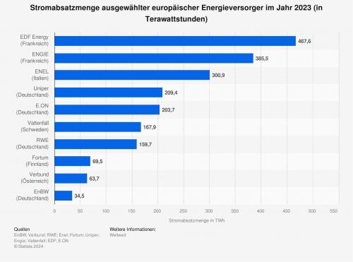 Die Statistik zeigt die Stromabsatzmenge ausgewählter europäischer Energieversorger im Jahr 2023. Im genannten Jahr setzte die Uniper SE rund 209 Terawattstunden Strom ab.