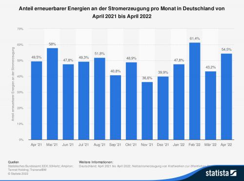 Die Statistik zeigt den monatlichen Anteil erneuerbarer Energien an der Stromerzeugung in Deutschland von April 2021 bis April 2022. Im April 2022 betrug der Anteil erneuerbarer Energien an der Stromerzeugung in Deutschland rund 54,5 %. Der Durchschnittswert für das Jahr 2022 lag bei 51,4 %. Die Werte basieren auf Zahlen des Statistischen Bundesamtes, der EEX und der vier Übertragungsnetzbetreiber Amprion, 50 Hertz, Tennet und Transnet BW.
