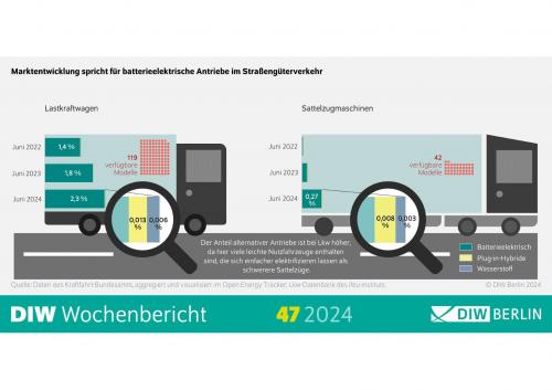 Prozent. „Eine klare Kommunikation der Bundespolitik zu Batterie-Lkw als zentraler Technologie könnte Lkw-Herstellern und -Betreibern Sicherheit bei anstehenden Investitionen geben“, meint Wolf-Peter Schill, Leiter des Forschungsbereichs „Transformation der Energiewirtschaft“ am DIW.