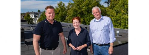 SWB-Chef Olaf Hermes (links) hat gemeinsam mit Oberbürgermeisterin Katja Dörner und Harald Meier, Sprecher der Eigentümergemeinschaft Lindenallee 13, die Mieterstrom-Anlage auf dem Mehrfamilienhaus in Bad Godesberg vorgestellt Quelle: SWB / Benjamin Westhoff |