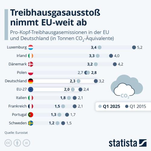Die Pro-Kopf-Treibhausgasemissionen in der Europäischen Union sind in den vergangenen zehn Jahren gesunken. Laut Daten von Eurostat lag der EU-Durchschnitt im ersten Quartal 2025 bei 2