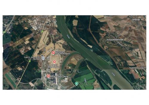 Das in Betrieb befindliche Kernkraftwerk Paks I (im Süden) und die erdfarbene Erweiterungsfläche für Paks II im Satellitenbild (zum Vergrößern bitte auf das Bild klicken) Quelle: Google Maps |