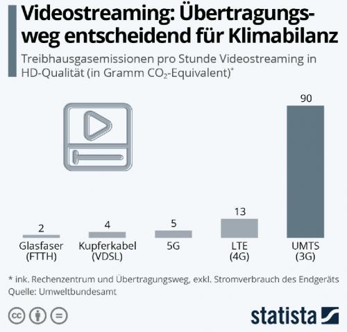 Videostreaming steht im Verdacht, schlecht für das Klima zu sein. Das Umweltbundesamt hat sich in einer Studie damit beschäftigt, wie viel Treibhausgasemissionen Onlinevideos tatsächlich verursachen. Demnach ist der im Rechenzentrum verursachte Anteil an den CO2-Emissionen mit jeweils 1,5 Gramm CO2 pro Stunde relativ gering. "Entscheidend für die Klimaverträglichkeit von Cloud-Diensten wie Video-Streaming ist hingegen, mit welcher Technik die Daten von dort zu den Nutzerinnen und Nutzern übertragen werden", wie es in der Pressemitteilung zur Studie heißt. Besonders wenig CO2 entsteht bei der Übertragung per Glasfaser. UMTS (3G) ist dagegen eine regelrechte Dreckschleuder.