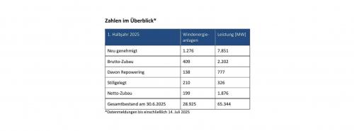 Entwicklung der Windkraft an Land im ersten Halbjahr 2025 (zur Vollansicht bitte auf die Tabelle klicken) Quelle: BWE |