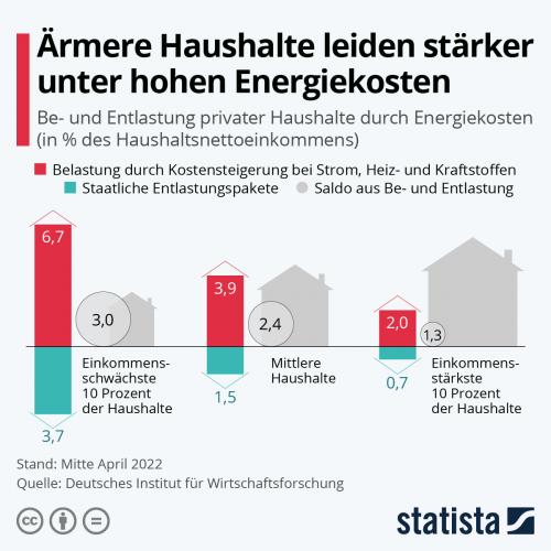 Die Preise für Energie sind durch den Krieg in der Ukraine stark gestiegen. Einkommensschwache Haushalte werden dabei durch die stark gestiegenen Energiekosten stärker belastet als mittlere oder einkommensstarke Haushalte. Das zeigt die Statista-Grafik auf Basis einer Berechnung des Deutschen Instituts für Wirtschaftsforschung (DIW). Die Studie untersucht, wie private Haushalte in Deutschland durch steigende Energiepreise belastet und durch Maßnahmen der Regierungskoalition entlastet werden. Dieser Belastungssaldo ist bei den einkommensschwächsten 10