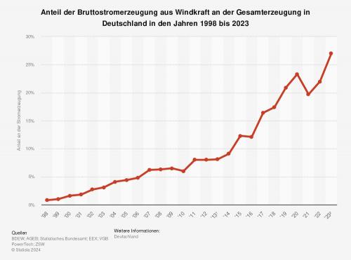 Im Jahr 2023 wurden durch die Windenergie an Land und auf See 27