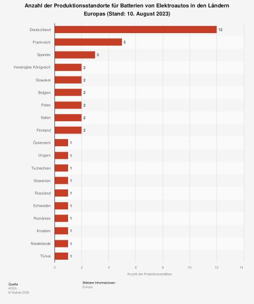 In Deutschland gab es im Jahr 2023 insgesamt zwölf Produktionsstätten für Batterien von Elektroautos. Damit lag Deutschland im europäischen Vergleich vorne. Es folgten Frankreich mit fünf Standorten für die Batterieproduktion und Spanien mit drei Standorten. In der EU gab es insgesamt 38 Produktionsanlagen.