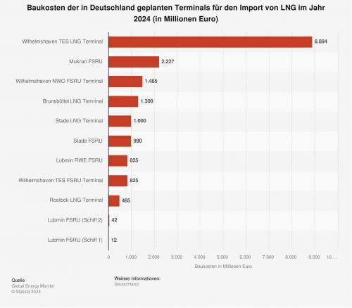 Im Jahr 2024 plant Deutschland den Bau von LNG-Terminals mit Baukosten von insgesamt rund 18 Milliarden Euro. Allein für das TES LNG-Terminal in Wilhelmshaven werden insgesamt knapp 8,9 Milliarden Euro Baukosten prognostiziert. Dies geht aus Angaben des Global Energy Monitors hervor.