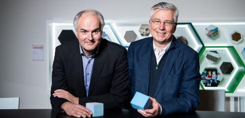 | Christoph Gürtler (l.) und Walter Leitner mit Proben des von ihnen entwickelten CO2-basierten Kunststoffs Cardyon Bild: EPA |