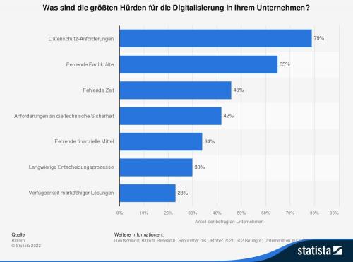 In einer Umfrage in Deutschland im Jahr 2021 gaben 79 Prozent der befragten Unternehmen an, dass Datenschutz-Anforderungen die größte Hürde für die Digitalisierung in ihrem Unternehmen seien. Laut der Umfrage ist neben dem Datenschutz der Fachkräftemangel ein weiteres Hindernis für die Digitalisierung.