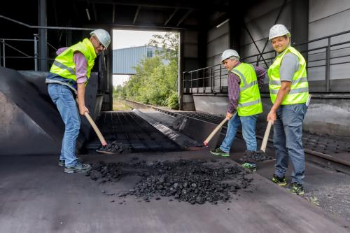 Millionen Euro. Hartmut Felsch (Werkleiter, links), Theo Maier (Leiter Heizkraftwerk, Mitte) und Josef Hofer (Projektleiter) schippten symbolisch die letzte Steinkohle ins Heizkraftwerk.